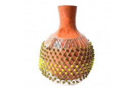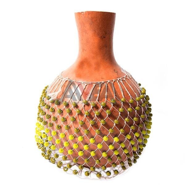 El shekere es un instrumento tradicional que se encuentra en África y Latinoamérica durante muchos años. Está formado de un fruto seco ahuecado. Malla de red con perlas en suspensión, caracoles (pequeñas conchas) y semillas secadas al sol de diferentes tipos. Diámetro: 20 x 15 x 15 cm